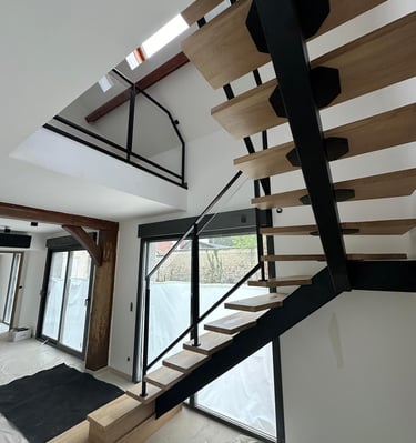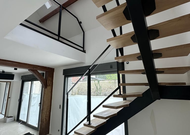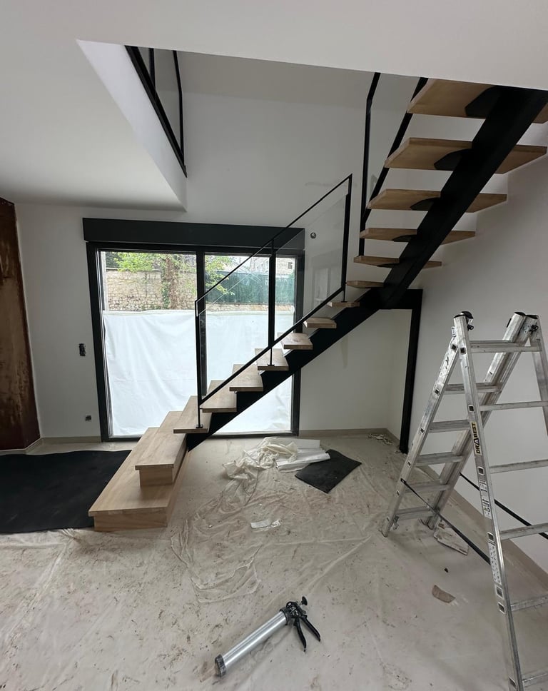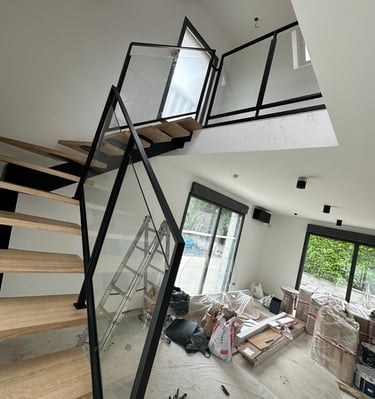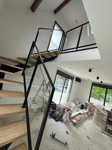Dans le cadre de la rénovation d’une maison, nous avons réalisé la pose d’un escalier alliant bois, métal et vitrage, véritable pièce maîtresse de l’espace de vie. Ce projet illustre parfaitement notre savoir-faire en installation d’escaliers sur mesure et en coordination tout corps d’état.