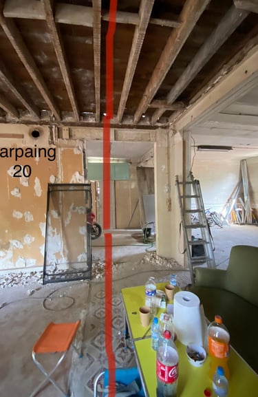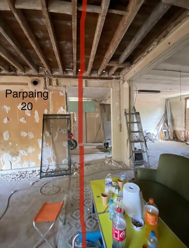Le projet nécessitait la division de la maison en deux logements distincts. Un mur mitoyen isolé et des murs de séparation avec le voisinage ont été construits afin d’assurer à la fois solidité, confort acoustique et respect des normes en vigueur.